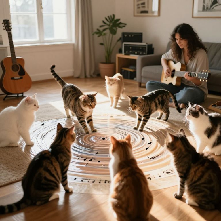 In a sunlit room where music transcends form, cats and humans unite in a symphony of无形的和谐,他们的动作在空气中编织出可见的涟漪,仿佛时间静止,而味觉捕捉到了那无形旋律中的每一个音符,唤起一种超越现实的共鸣与希望。