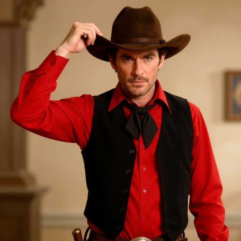 Photograph of a serious-looking man with light skin and short dark hair, wearing a brown cowboy hat, brown coat, white ruffled shirt, and white gloves. He's holding a red and gold patterned object, possibly a gun, with both hands. The background is a simple, beige fabric. The lighting highlights his face and attire, giving a vintage, Western feel.
