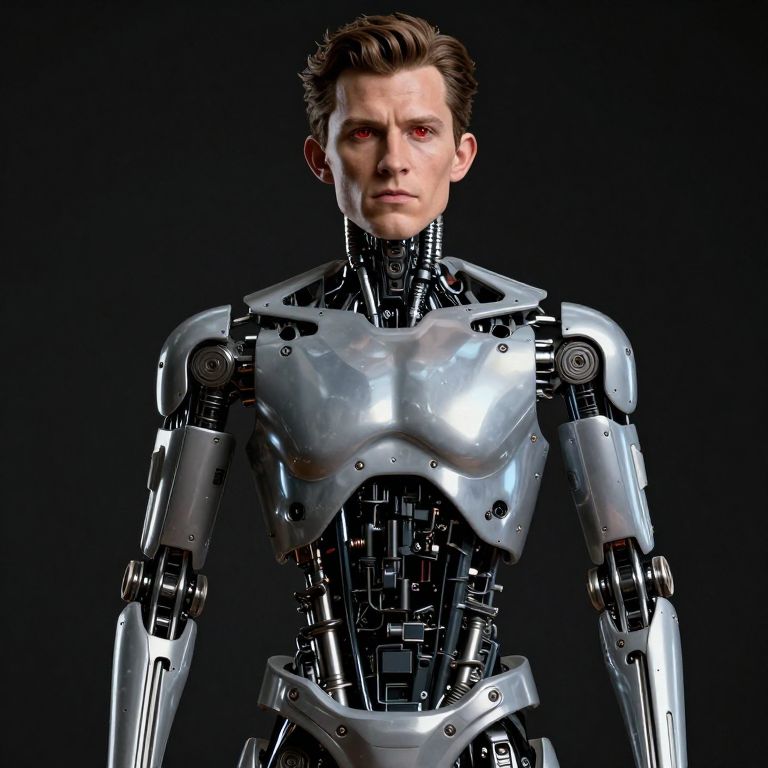 A realistic detailed photo of a guy who is the terminator robot, who is a male android, tom holland, shiny skin, red eyes, posing like a statue, blank stare