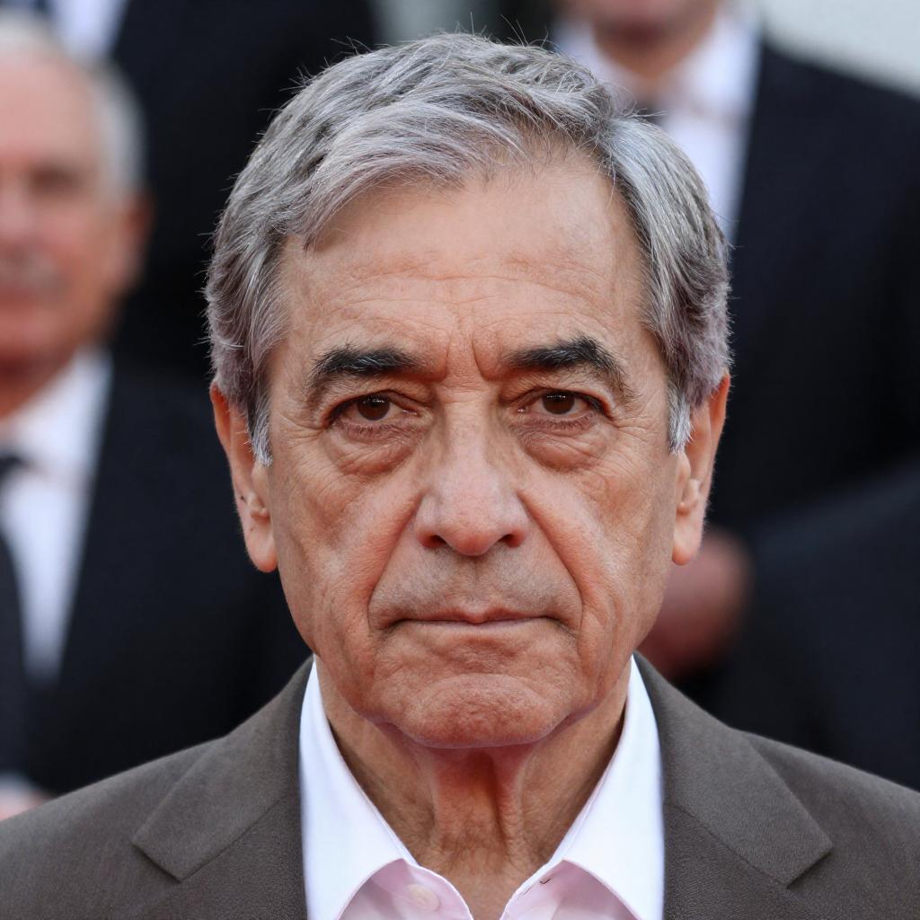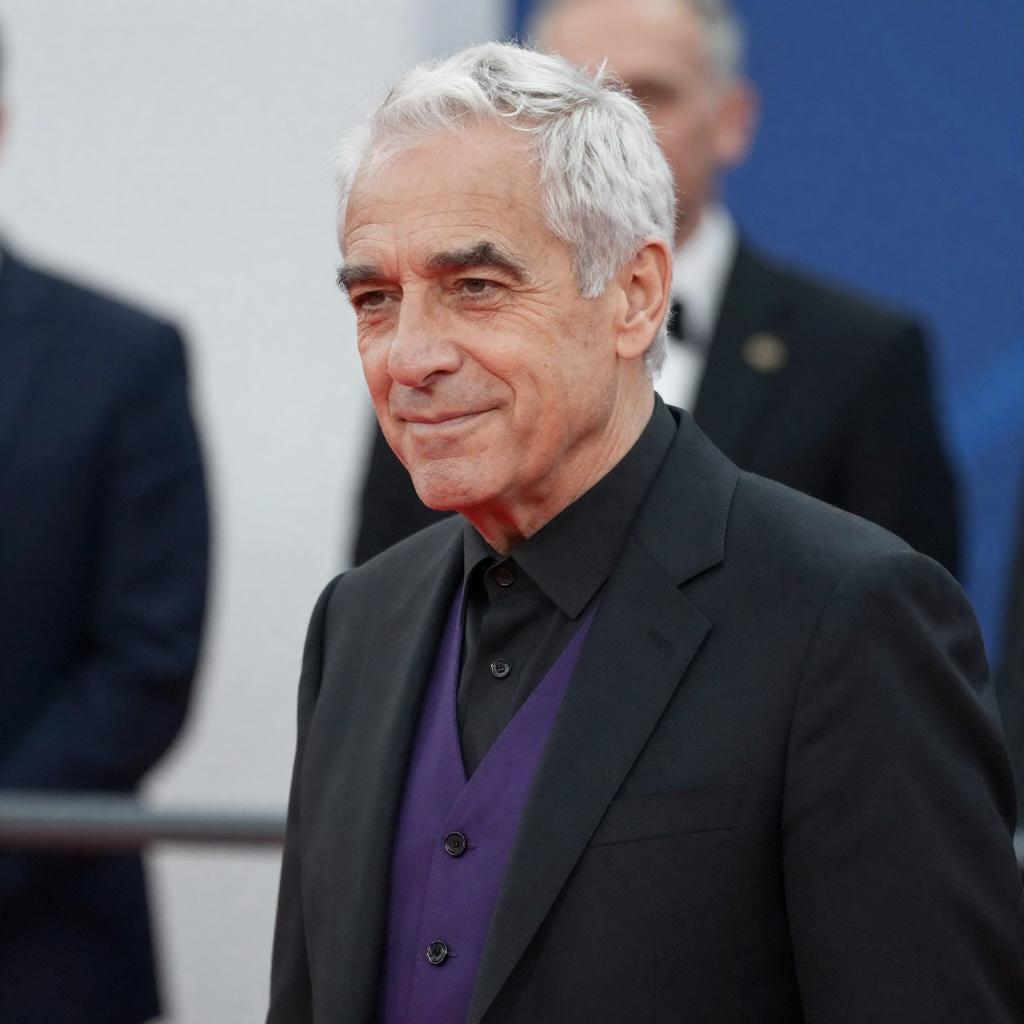 Middle-aged man with white hair, black suit, and purple vest, slightly smiling, looking to the side. Background: blurry figures, blue and white setting, metal railings. Soft lighting.
