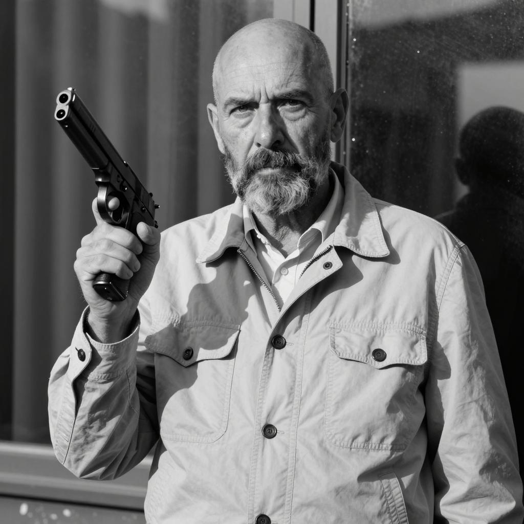 Bald middle-aged man in dark jacket with white stripes, gray pants, standing in dimly lit doorway. Shadowed face, intense expression. Greenish light on left. Dark background, vertical door frames on sides. Mid-action pose.