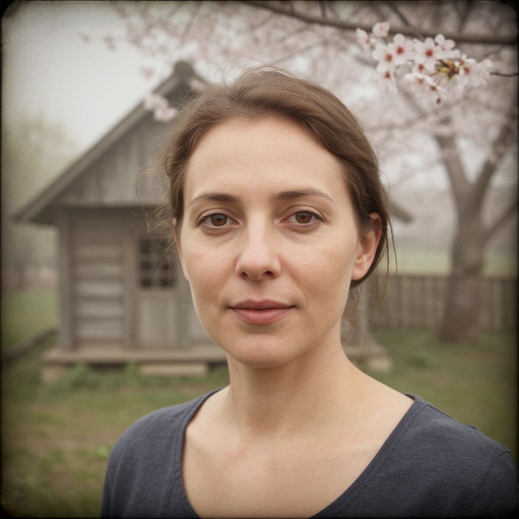 Photograph of a middle-aged woman with green eyes, fair skin, and brown hair, standing in a dense forest with sunlight filtering through the trees.