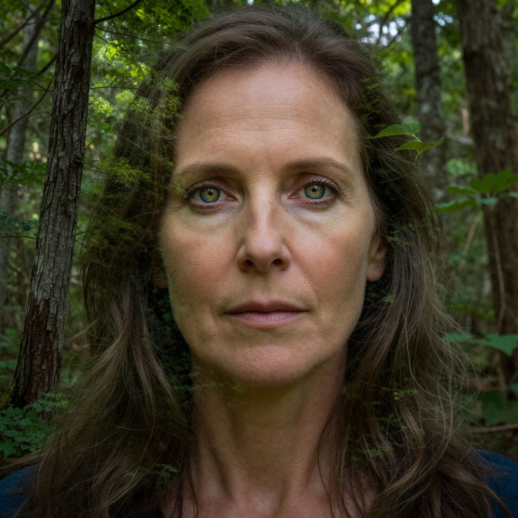 Craft a photorealistic portrait of a middle-aged woman exuding an air of enigma and sagacity. Her visage should be partially concealed by a dense forest backdrop where the trees seamlessly blend with her hair and features. The woman's eyes will shine with a piercing gaze that cuts through the overlapping foliage, revealing both the depth of the woods and her character's essence. This interplay between subject and surroundings is characterized by a sharp contrast in texture and tone; the rough bark and vibrant greens of the forest stand against the smooth skin and subtle hues of her face. The double exposure effect evokes harmony, suggesting that she emerges from and returns to the wilderness that surrounds her.