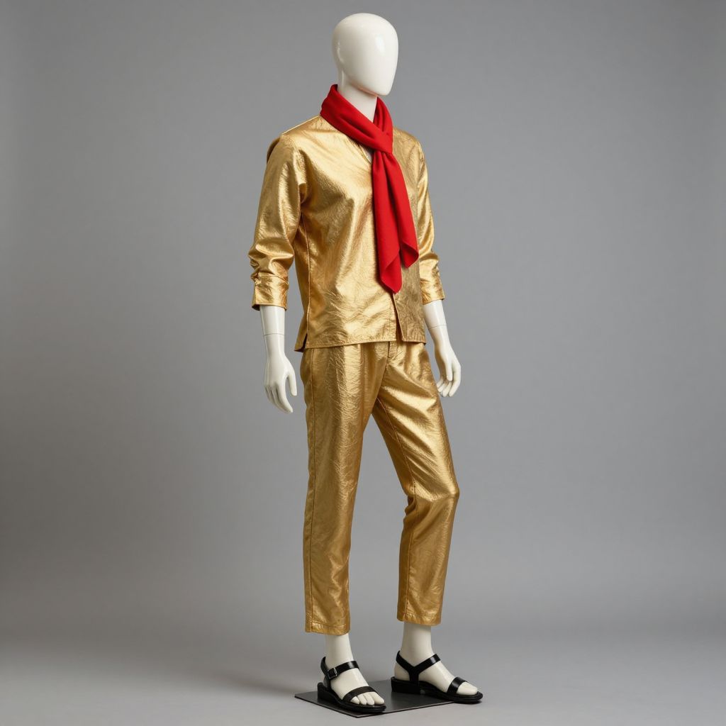A mannequin wearing a gold outfit with a red scarf around his neck and a pair of black sandals. The mannequin has a sleek, modern design with a confident posture, showcasing a stylish and sophisticated look. The red scarf adds a bold statement to the outfit, while the black sandals emphasize a classic, elegant aesthetic. The overall image is vibrant and eye-catching, highlighting the mannequin's refined appearance and the striking contrast between the gold and red elements.
