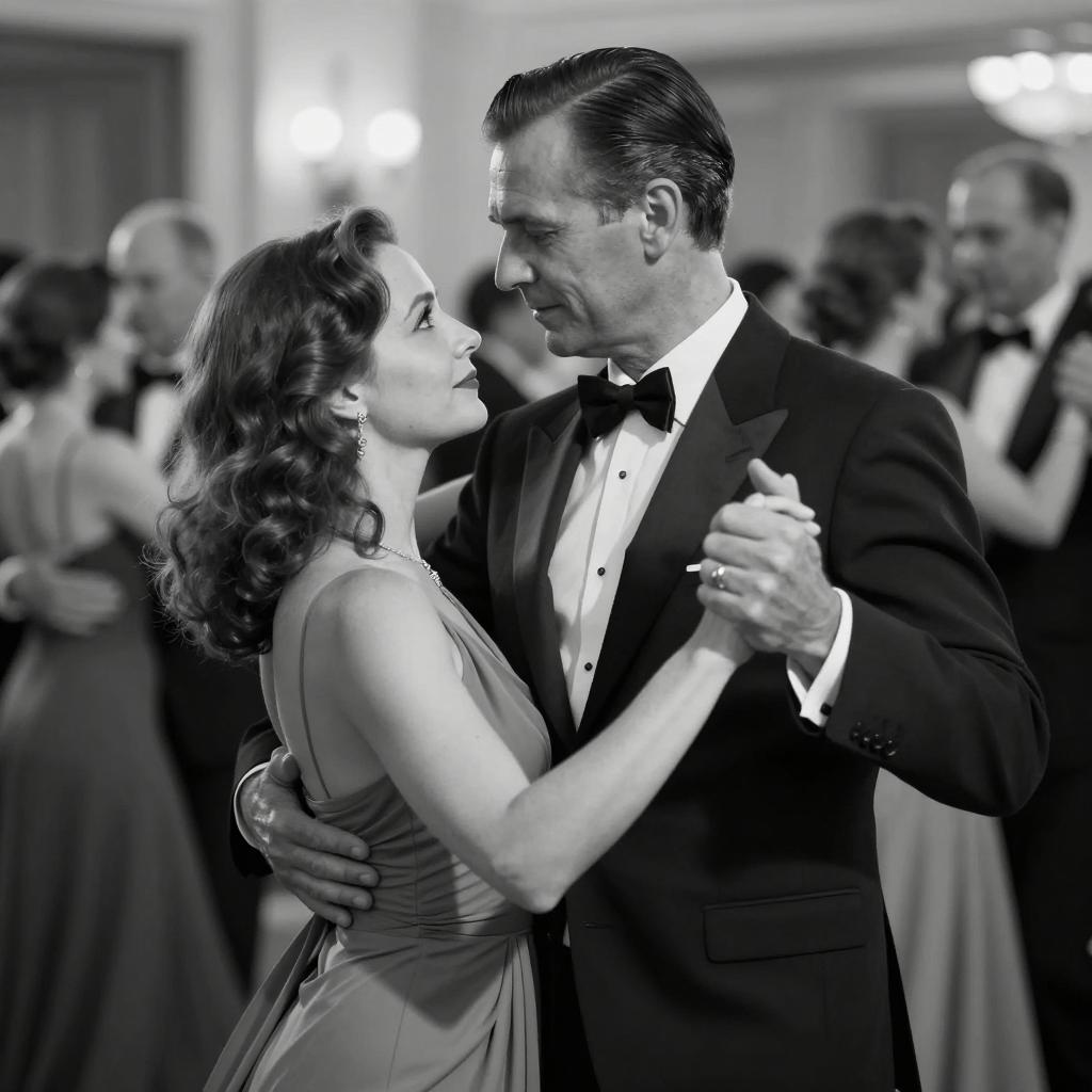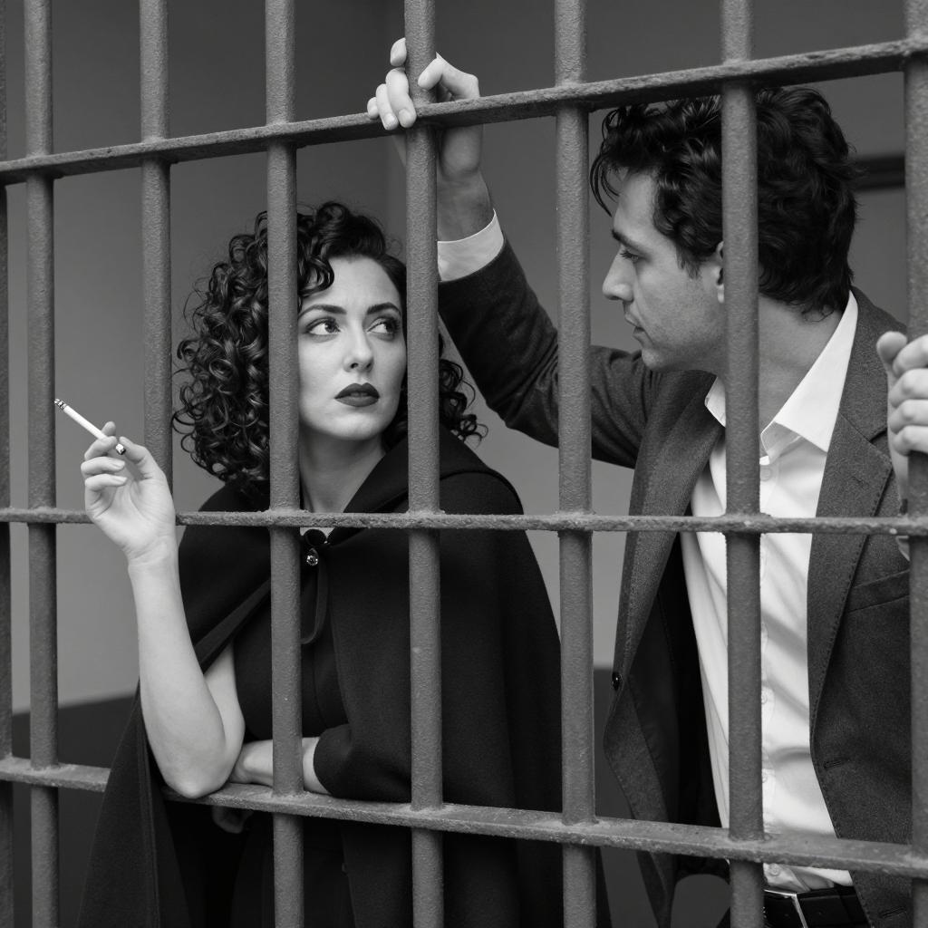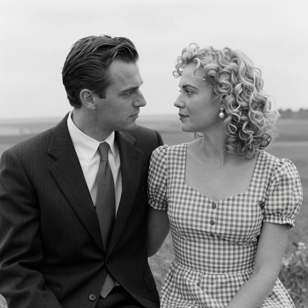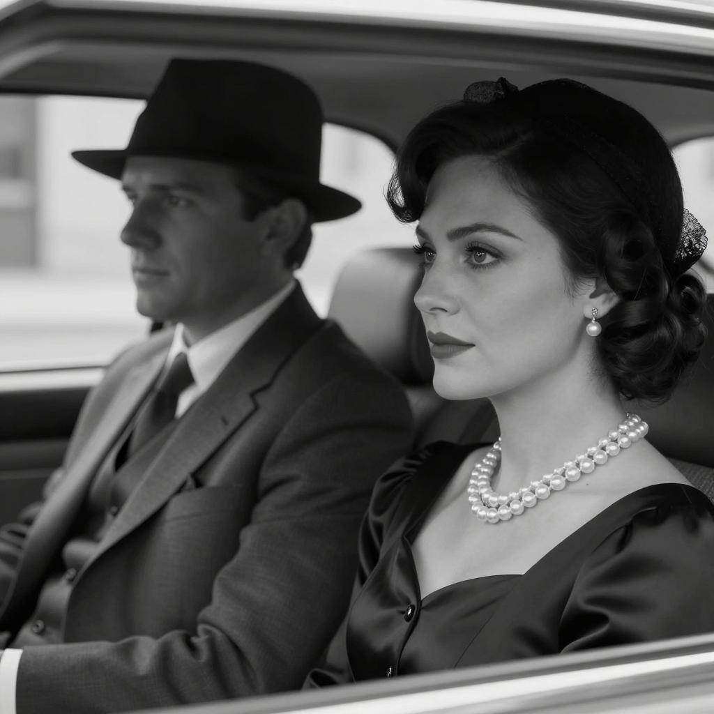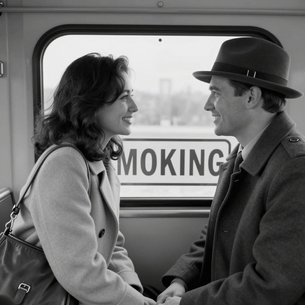 Black and white photograph of two people in a vehicle. Woman with wavy hair, light coat, and shoulder bag leans in, smiling at man in hat and coat. "SMOKING" sign on window behind them. Man smiles back. Both in profile.