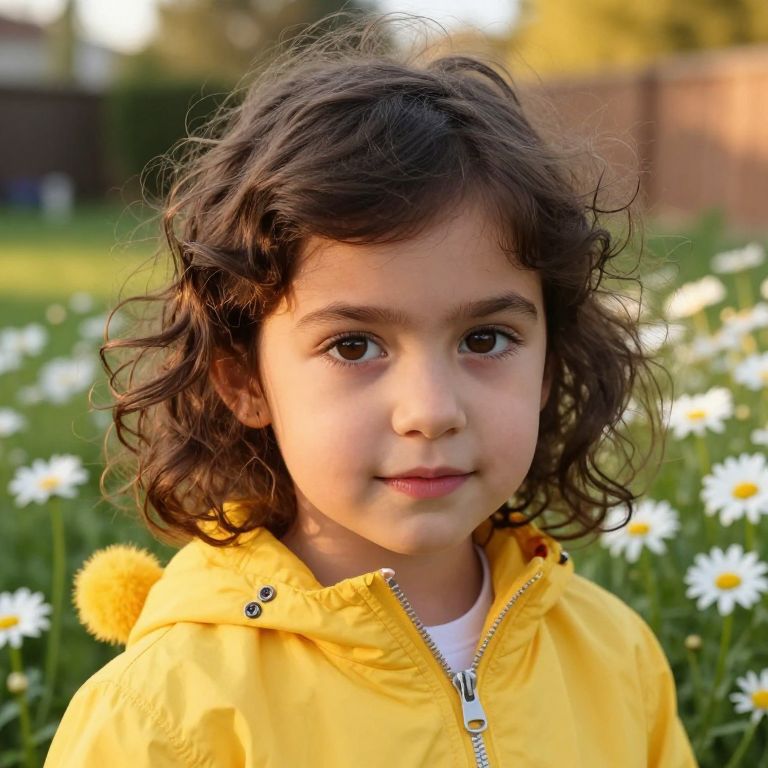 Photograph of a young girl with medium-length, wavy dark brown hair and olive skin, standing in a field of white daisies with yellow centers. She has large, dark brown eyes and a slight smile. She wears a bright yellow raincoat with a white shirt underneath. The background is slightly blurred, showing green grass and a brick wall in the distance, with sunlight casting a warm glow. Her expression is calm and gentle. The image has a shallow depth of field, focusing on her face while the daisies in the background are softly out of focus.