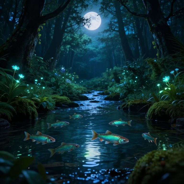 Digital artwork of a mystical, bioluminescent forest stream at twilight, with glowing plants and a purple-pink sky reflecting on the water.