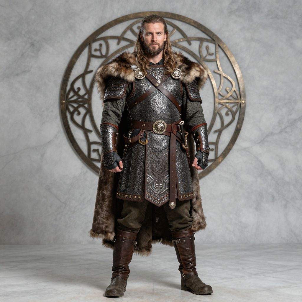 Man with long blonde hair and a beard wearing a medieval costume with a belt and a shield on his chest.