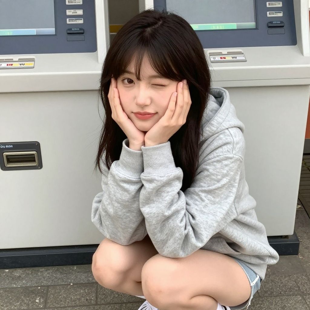 1girl, :3, :D, hoodie, shorts, squatting, from below, looking at viewer, half-closed eyes, atms support, hand on own cheek