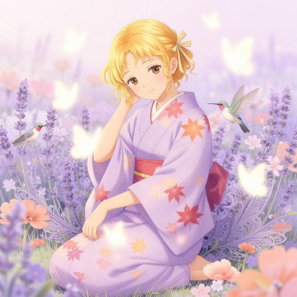 Anime-style illustration of a serene young woman with golden curled hair tied with a ribbon, wearing a pastel purple kimono adorned with maple leaf and hummingbird patterns. She is seated with her arms resting on her knees, surrounded by glowing butterflies, hummingbirds, and intricate lavender foliage. The background features a softly lit, dreamlike flower field in shades of lavender, pink, and pale orange, creating a whimsical and magical atmosphere.
