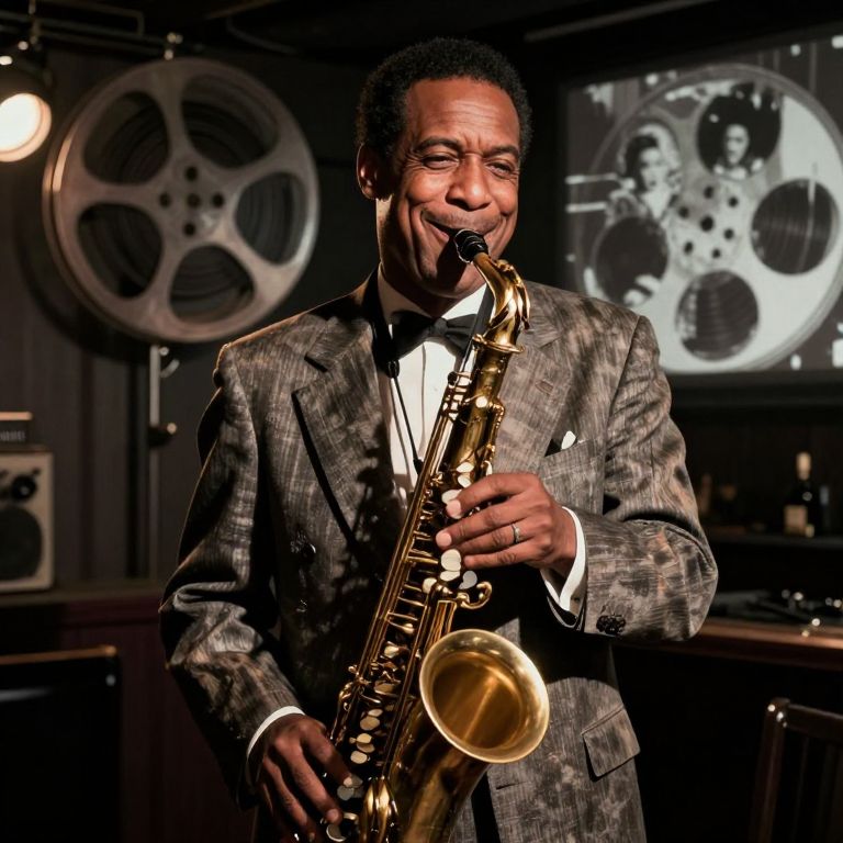 A charismatic jazz musician stands amidst the dimly lit ambiance of a speakeasy, his face bathed in the warm radiance of a nearby spotlight. The soft illumination caresses his features, accentuating the intricate creases around his eyes and the joyous smile that graces his lips as he weaves an intricate melody on his saxophone. Behind him, a vintage movie reel flickers to life, projecting fragments of classic Hollywood glamour onto his weathered suit and into the shadows that rhythmically dance with his music. The scenes from the black-and-white film seamlessly merge with the live-action portrait, crafting a captivating visual narrative that pays homage to the timeless allure shared by both art forms. This vivid double exposure portrait encapsulates the essence of a bygone era while celebrating the enduring power of music to transcend time and transform lives.