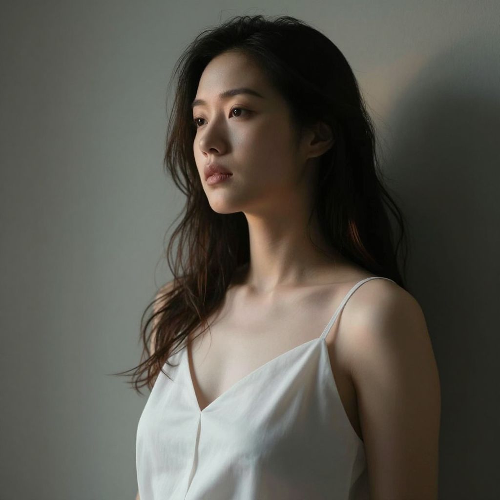 Photograph of an Asian woman with long, dark hair, wearing a white, spaghetti-strap top, standing against a gray wall, illuminated by soft