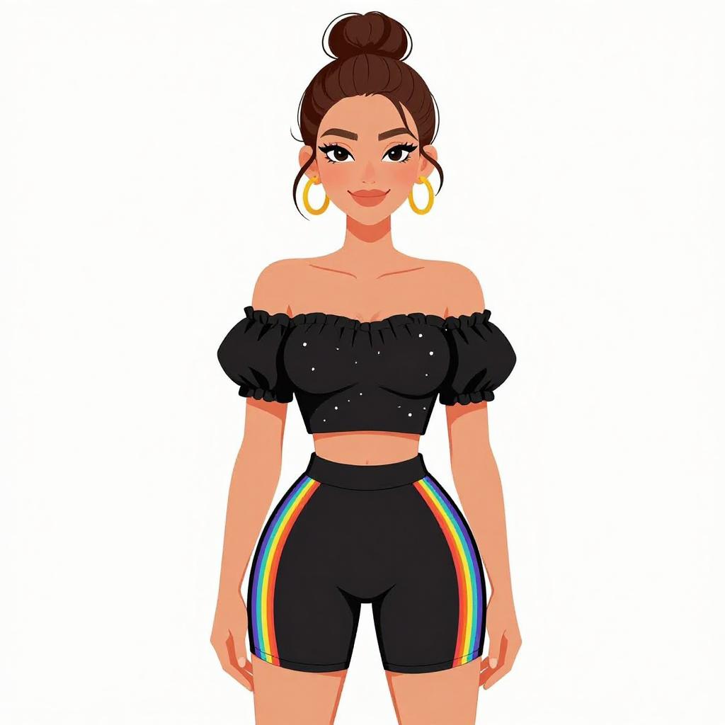 Digital illustration of a smiling woman with brown hair, wearing a black "POTIS LOVE" shirt and purple pants, against a light blue background.
