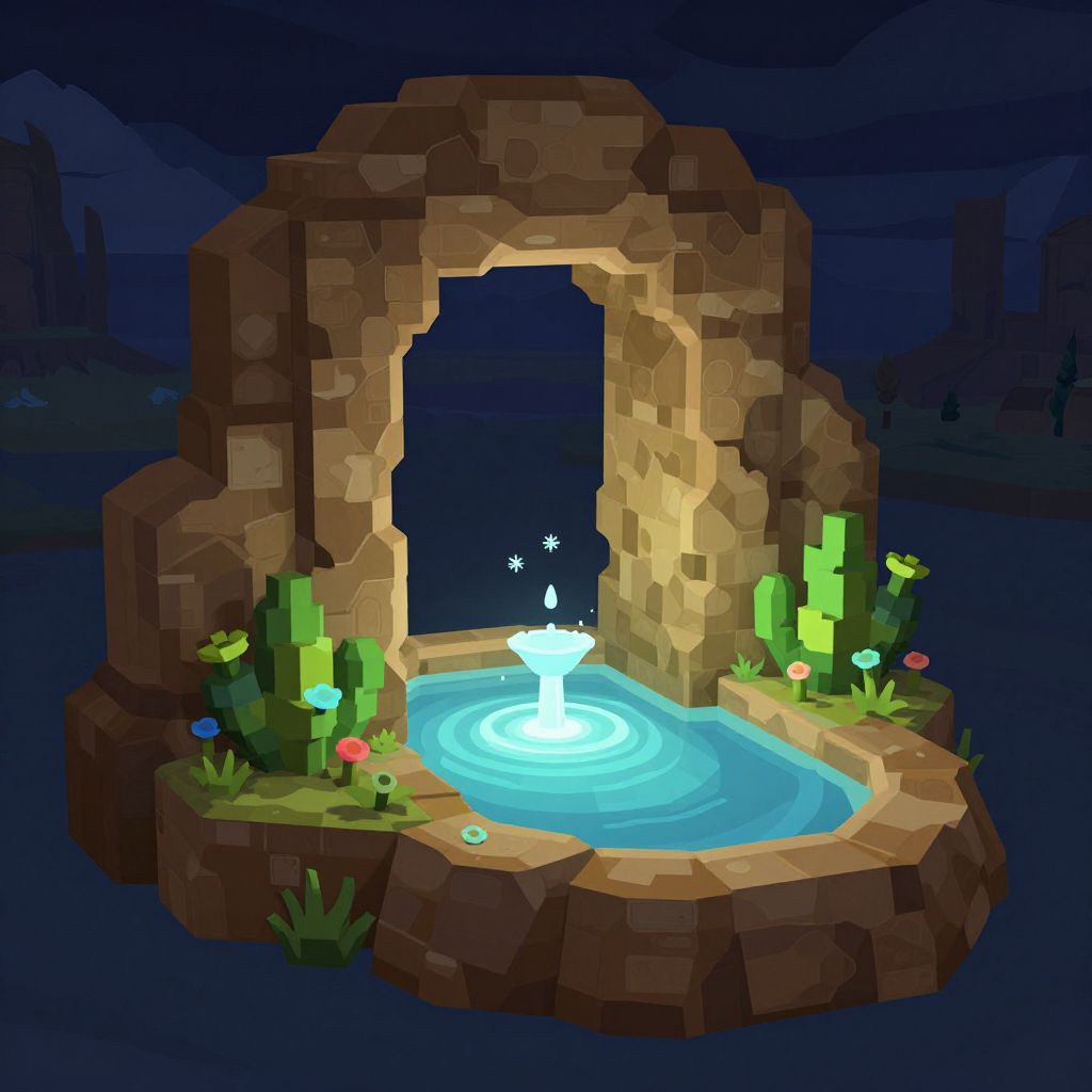 This digital pixel art image features a glowing blue fountain situated within a stone archway at night. The water ripples around the fountain, emitting light that sparkles. Surrounding the fountain are green plants, small flowers in varied colors, and grass. The stone arch has a textured, brownish appearance with hexagonal patterns. The background is a dark blue night sky with faint silhouettes of mountains. The overall style is reminiscent of 8-bit video game graphics, with bold, blocky colors and simple shapes.
