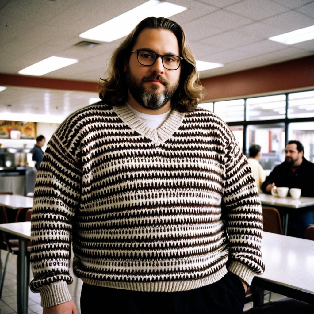 The Big Lebowski The Dude Man Plus Size Sweater, man with glasses and a sweater standing in a cafeteria