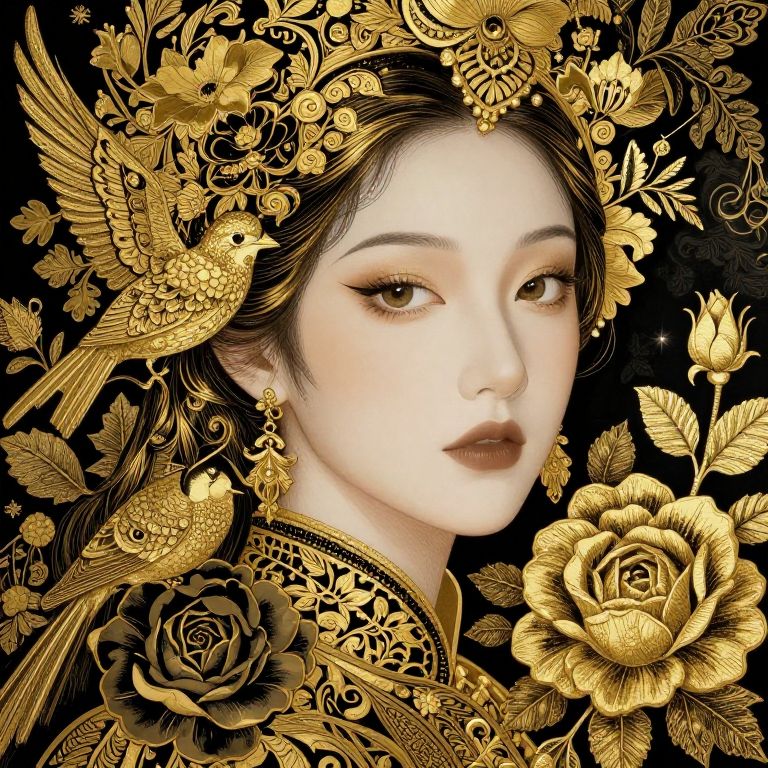 Digital portrait of a serene Asian woman with flawless skin, golden eyes, and delicate features, adorned with intricate gold floral and bird motifs, surrounded by large