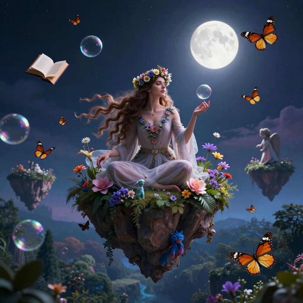 (high quality:1.4), (best quality:1.4), (masterpiece:1.4), official art, official wallpaper, surreal, beautifulgoddess, (1woman:1.1), (long wavy hair:1.1), (flower crown:1.1), (mystical creatures:1.1), (floating islands:1.1), (detailed landscape:1.1), (magic in the air:1.1), (stardu BREAK 1.1), night sky, (whimsical atmosphere:1.1), (dreamlike world:1.1), (bubbles:1.1), flying books, (luna moths:1.1), (moonlight:1.1), enchanted forest, (wisdom:1.1), (powerful energy:1.1), (guardian angels:1.1), (peaceful:1.1), vibrant colors, (detailed:1.05), (extremely detailed:1.06), sharp focus, (intricate:1.03), cinematic lighting, (extremely intricate:1.04), (epic scenery:1.09), (beautiful scenery:1.08), (detailed scenery:1.08), (intricate scenery:1.07), (wonderful scenery:1.05), (sharp focus, absurdres, high quality, masterpiece, highres, best quality:1.5)