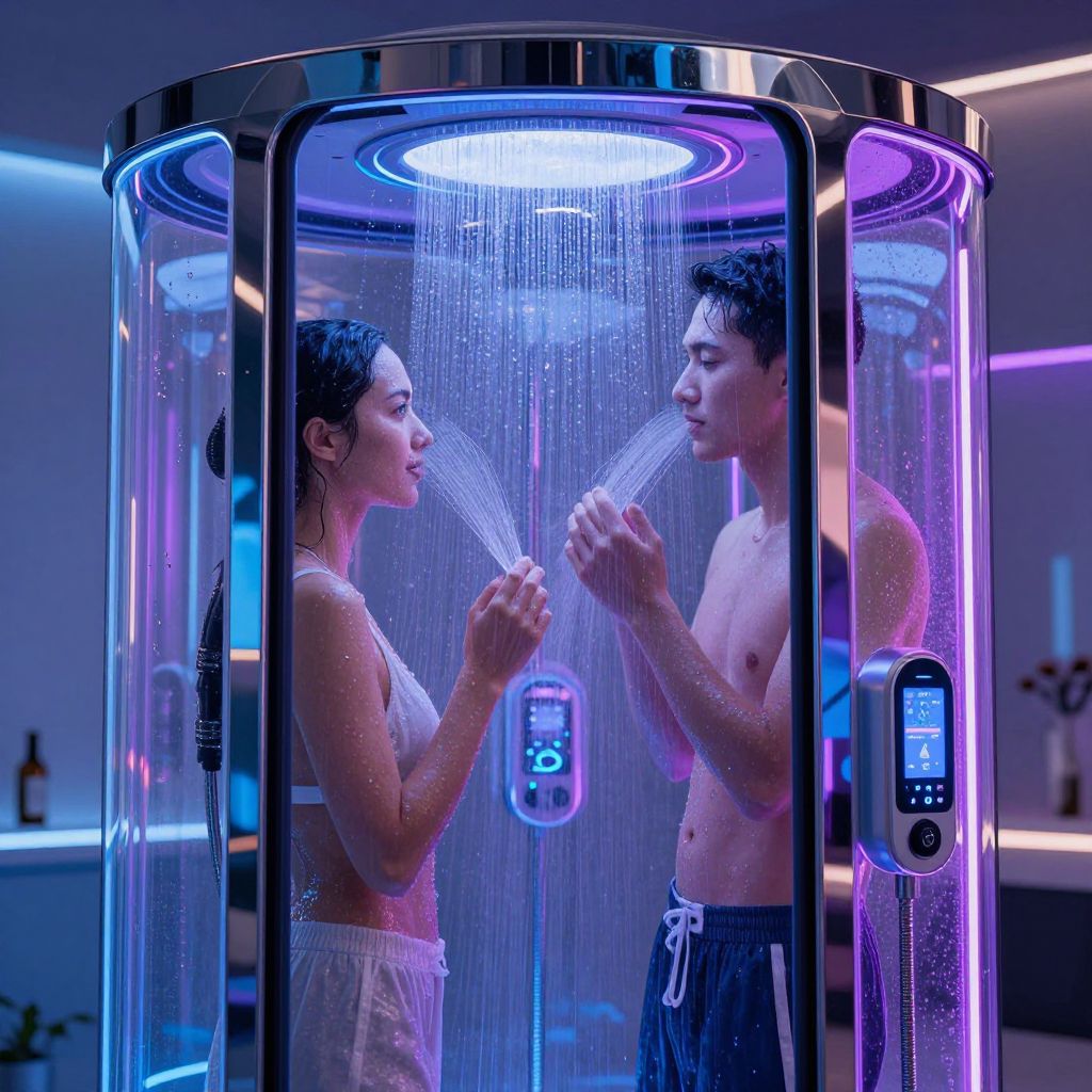 Sharing shower experience in a futuristic transparent pod with digital controls, two figures enjoying water sprays with neon blue and purple lighting effects, sleek chrome and glass surfaces reflecting vibrant hues, sci-fi vibe, ultra-modern and elegant design details.