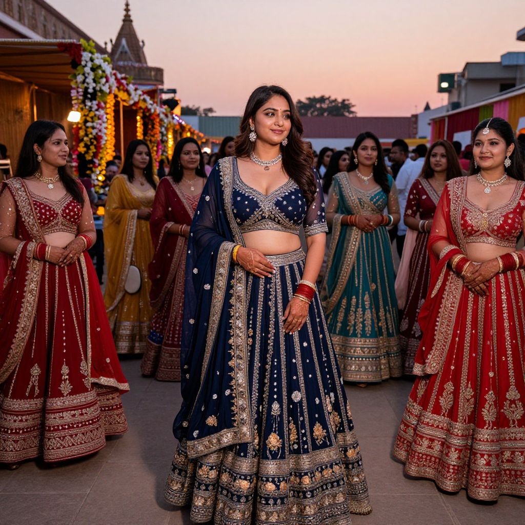 A festive lehenga wedding party at a temple-adjacent wedding in Uttar Pradesh, with women dressed in hand-embroidered lehengas, some with gold embroidery on the borders and floral motifs; a woman with soft brown skin, fair complexion, and a gentle smile in a deep navy blue lehenga with silver zari patterns is surrounded by friends in colorful red and gold lehengas, standing in a crowded courtyard with flower stalls and traditional music in the background, the sky glowing with soft pink and orange hues at dusk.. The woman has big tits and cute face