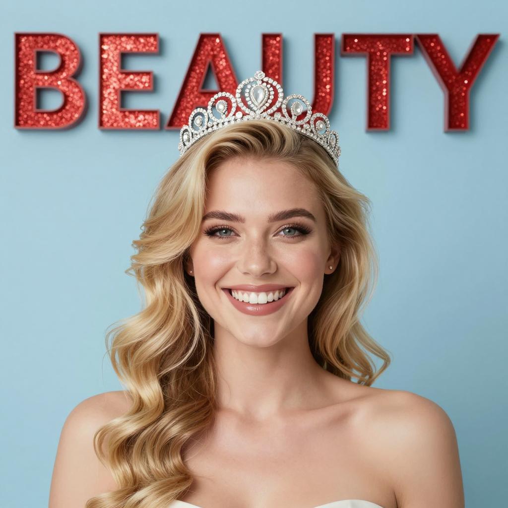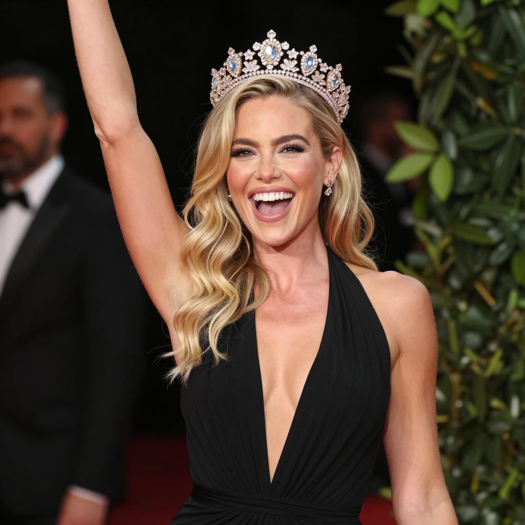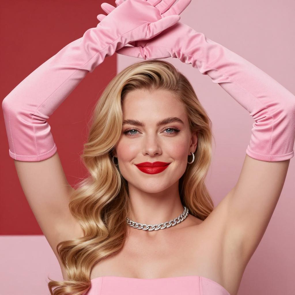 Blonde woman in pink strapless dress and matching long gloves, arms raised, wearing large silver necklace, smiling. Dark stage background with faintly visible audience. Bright spotlight from above. Vibrant, 1980s style. One woman.