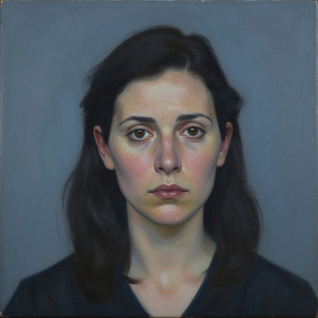 Realistic oil painting of a solemn-faced woman with pale skin, dark brown hair, and brown eyes, wearing a black top, against a blue-gray