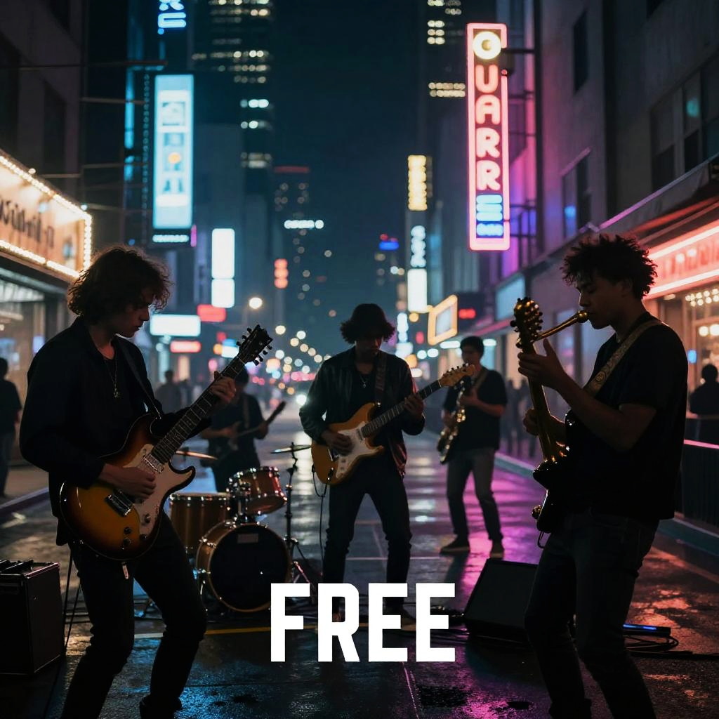 Free cover art for music portraying an urban night scene with glowing neon lights and silhouettes of musicians playing instruments, energetic and moody vibe, designed with detailed textures and contrasting colors to reflect the pulse of city nightlife.