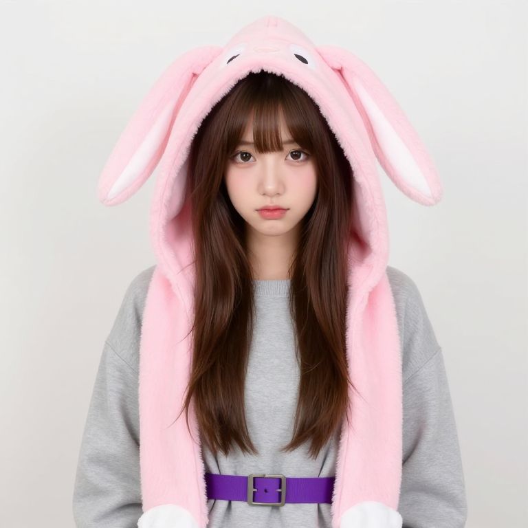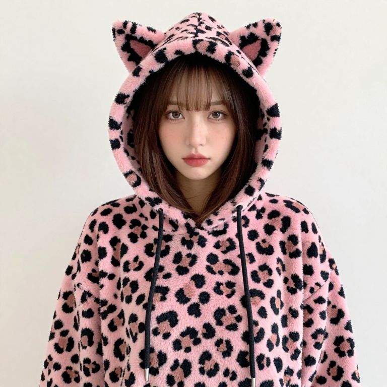 Female wearing a pink and black leopard print hoodie with a cat ears on the top.