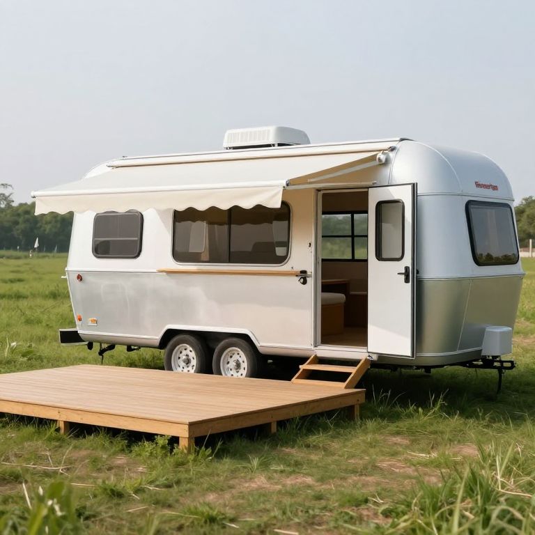 Free Spirit trailer parked on grassy terrain with a wooden sun deck platform positioned to its left, featuring an extended awning and open door revealing an inviting interior.