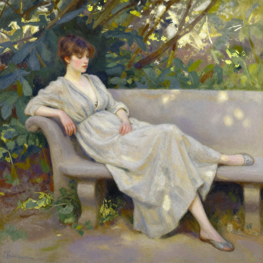 A young woman in a flowing linen gown relaxes on a stone bench in a lush garden, surrounded by greenery and dappled sunlight, in an abstract watercolor painting by John Singer Sargent.