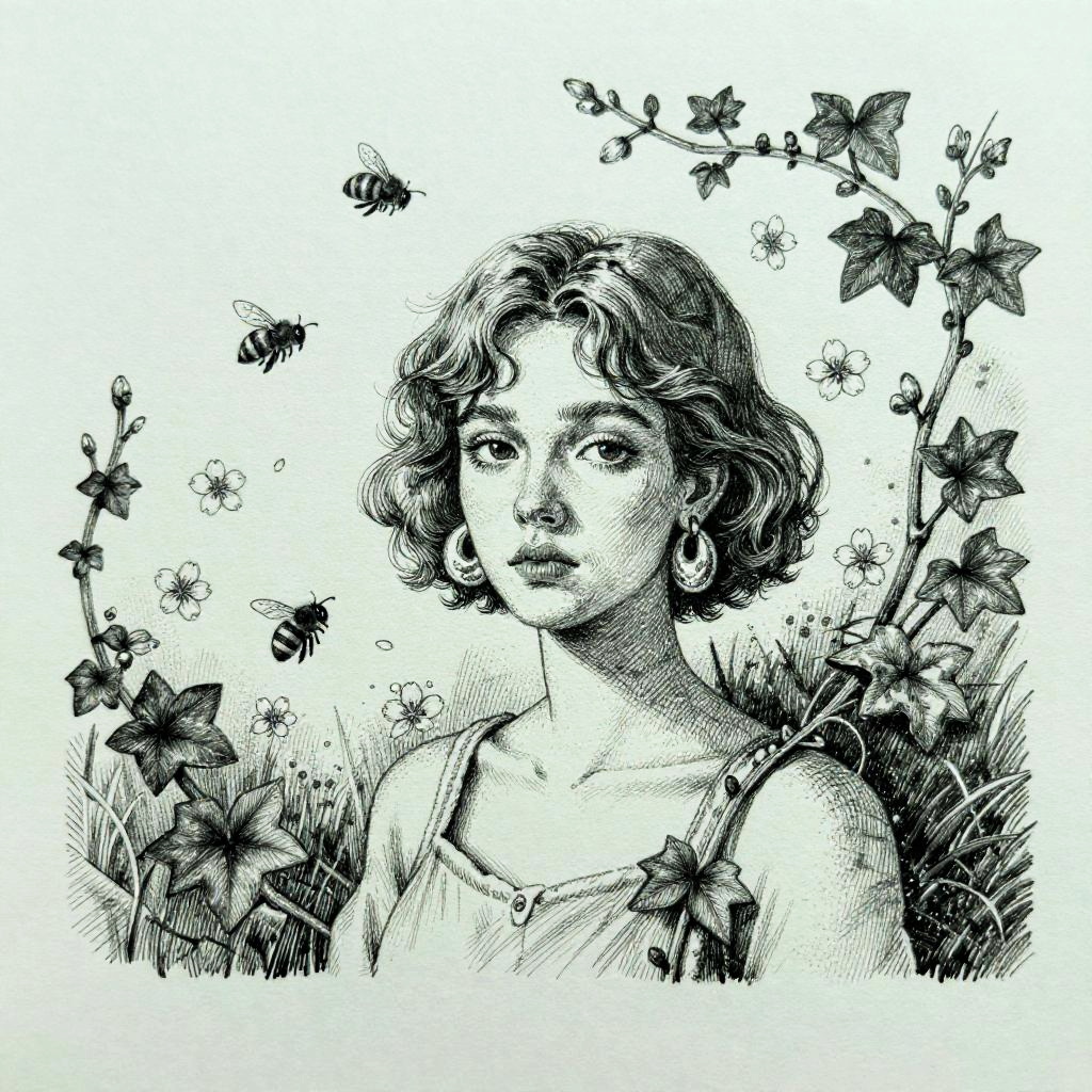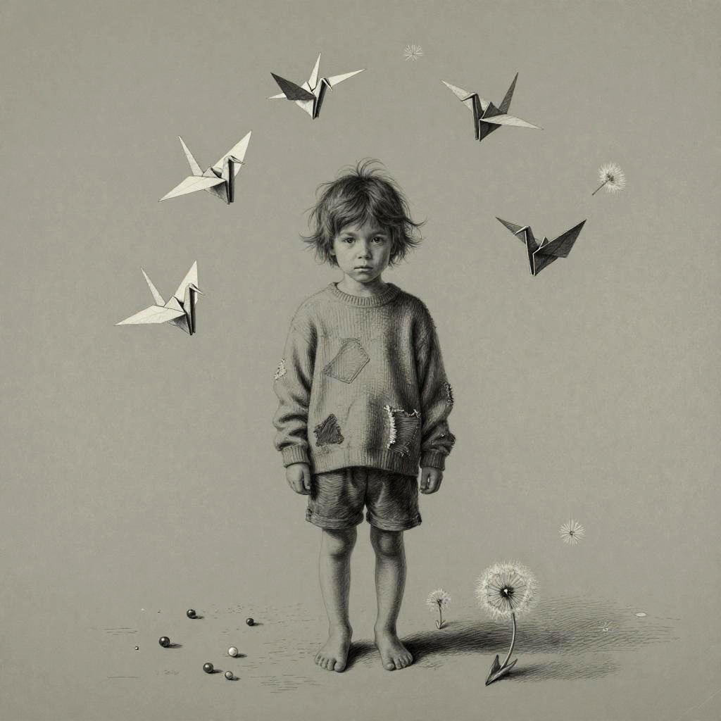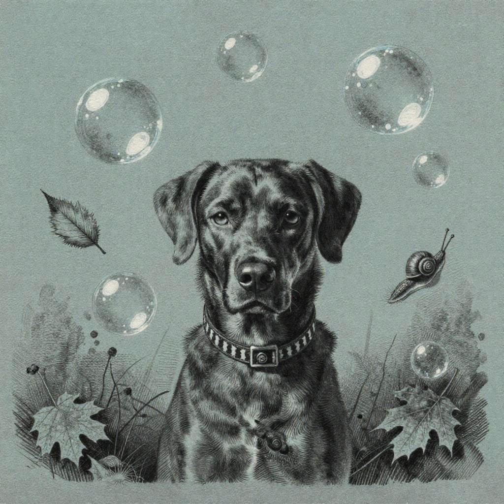 Soft charcoal rendering with visible finger blending on a greenish-teal wash, monochrome linework with subtle halftone grain. Center frame, a pensive dog with floppy ears and a patterned collar holds a quiet, serious gaze. Around them drift floating soap bubbles, scattered autumn leaves, and small garden snails, shaping a quirky, surreal atmosphere. Crosshatching, smudged edges, paper tooth, slight misregistration. Soft diffuse light, calm negative space, high-contrast silhouettes, gentle vignette. Melancholy mood, handmade imperfections, tactile ink, steady composition.