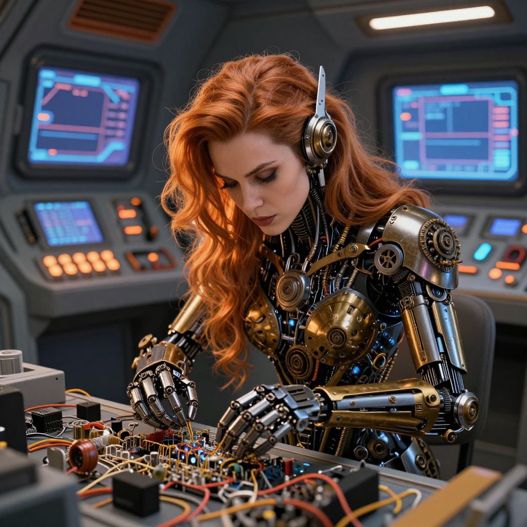 In this captivating image, a beautiful space vixen, adorned in intricate, mechanical armor, is seen inside a spaceship, meticulously repairing an array of complex electronics. Her long, flowing hair cascades down, illuminated by the warm glow of the spaceship's interior lights. The armor she wears is a marvel of engineering, featuring a myriad of gears, bolts, and circuitry, each component meticulously crafted and interwoven. The vixen's hands, covered in a network of mechanical extensions, are deftly manipulating the delicate electronics, their movements precise and deliberate. The spaceship's control panel, a vast array of screens and buttons, serves as the backdrop to this scene, its blue and orange hues contrasting with the mechanical tones of the vixen's armor. The overall composition is dynamic, with the vixen at the center, surrounded by the intricate details of her surroundings, creating a sense of depth and immersion. The interplay of colors, textures, and shapes paints a vivid picture of a futuristic, high-tech environment, where human ingenuity and advanced technology converge.