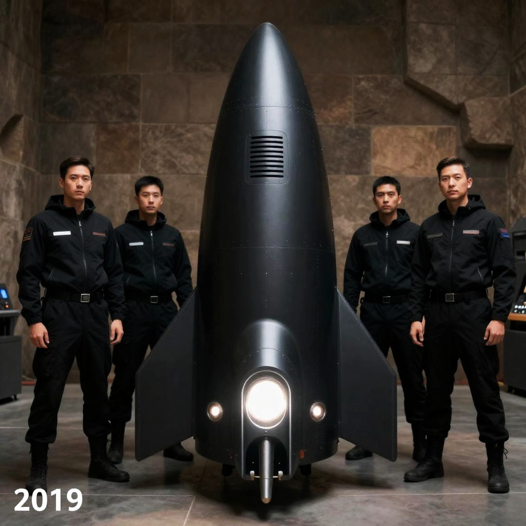 Photograph of a large, futuristic, black, rocket-like machine with a glowing front and dual headlights. Four men in black, hooded suits stand behind it. They have serious expressions. Background is a rough, brown, stone wall. Machine is centered, men are to the left. 2019 timestamp in bottom left corner.