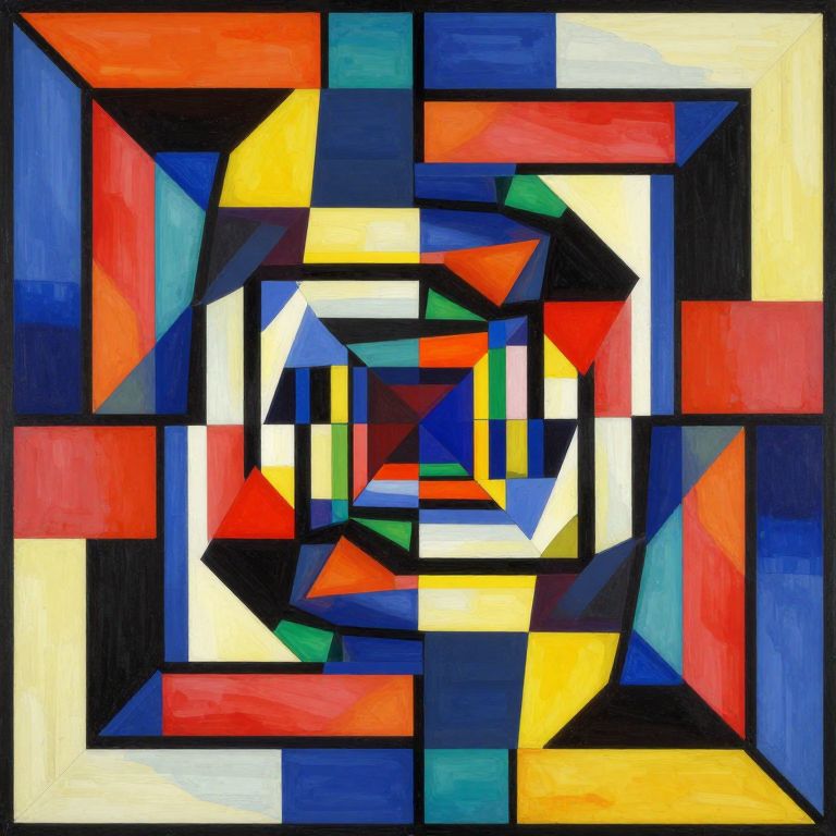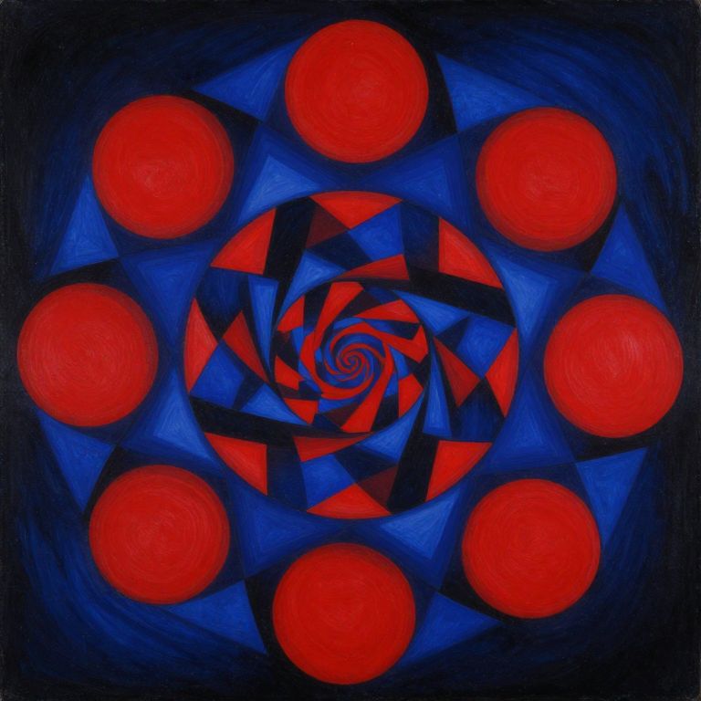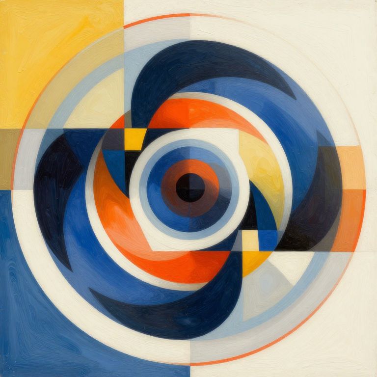 Craft an abstract geometric composition inspired by Kandinsky's exploration of color theory. At its heart, place a large, vivid circle composed of intricate lines and shapes radiating from its center, capturing dynamic motion and energy. Surrounding this core are smaller, more static geometric forms—triangles, squares, and polygons—that interact with the central shape in a balanced yet asymmetrical manner, suggesting an emotional gradient that transitions from lively to contemplative as one's gaze traverses the canvas. Employ a bold and harmonious color palette using complementary colors to amplify the visual impact of the composition and evoke both harmony and tension within the abstract representation.