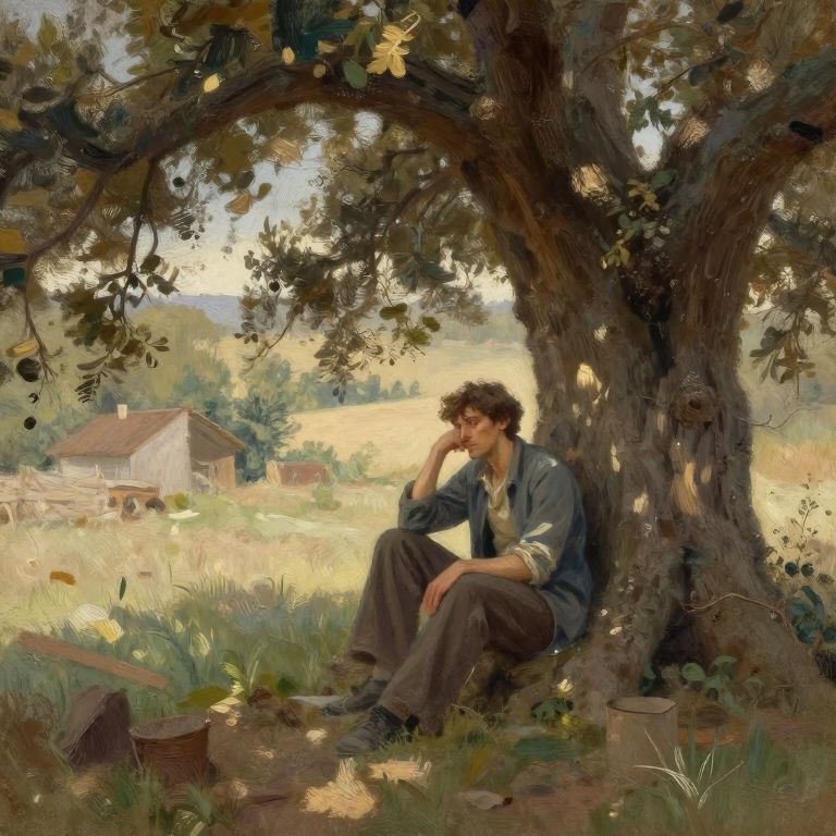 Myshkin depicted as a thoughtful philosopher sitting under a large oak tree in a rustic countryside, sunlight dappling through leaves, subtle earth tones, detailed textured brushstrokes, evoking a meditative and peaceful atmosphere.