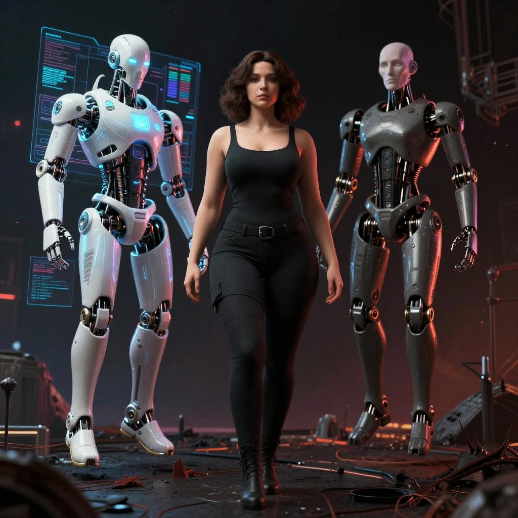Realistic photo.a curvy woman and a robotic hero surrounded by a synthesized hologram AI, floating in a brutalist space sky, gothic, rich deep colors, in the style of Francis Bacon, rendered in Blender, ultra-realistic, smooth shadows, ultra detail, high resolution, cinematic, Unreal Engine 6, 8k 3D realistic photo