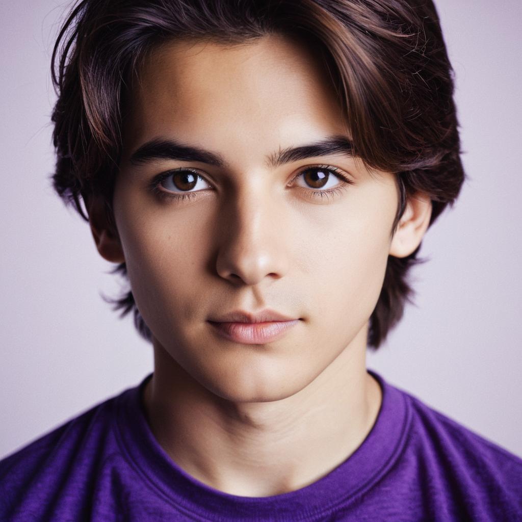 Close-up portrait of a young man with short brown and black hair, brown eyes, wearing a high-neck black undershirt and a cream-colored knitted sweater against a dark background. The subject has a neutral expression with closed mouth, looking directly at the camera.