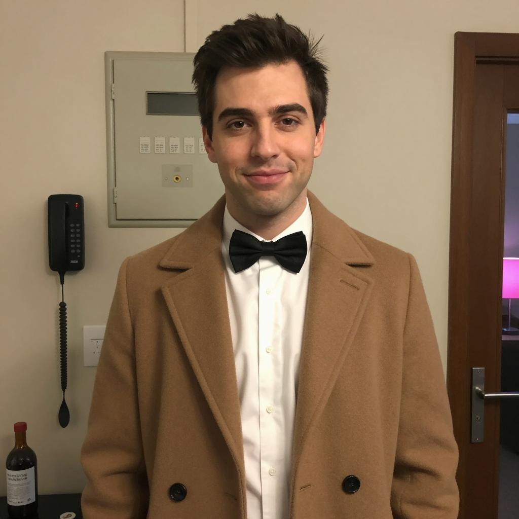 Man with short dark hair, fair skin, slight smile, wearing brown overcoat, black bow tie, white shirt, standing indoors. Background has beige walls, electrical panel, phone, and labeled bottle on right. Door and pink lamp in background. Casual setting.