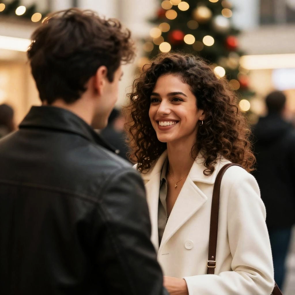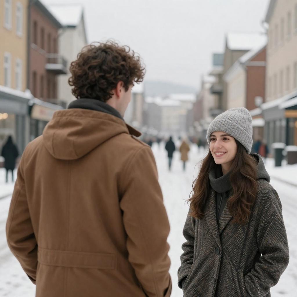 Photograph of two women walking on a snowy street. The woman on the left has curly brown hair, wears a dark coat with a white scarf, and smiles. The woman on the right has blonde hair, wears a blue beanie, light blue turtleneck, and dark coat, carrying a white handbag, smiling. Brick buildings with Christmas decorations in the background. Another woman in a brown coat walks in the background. Snow on the ground.