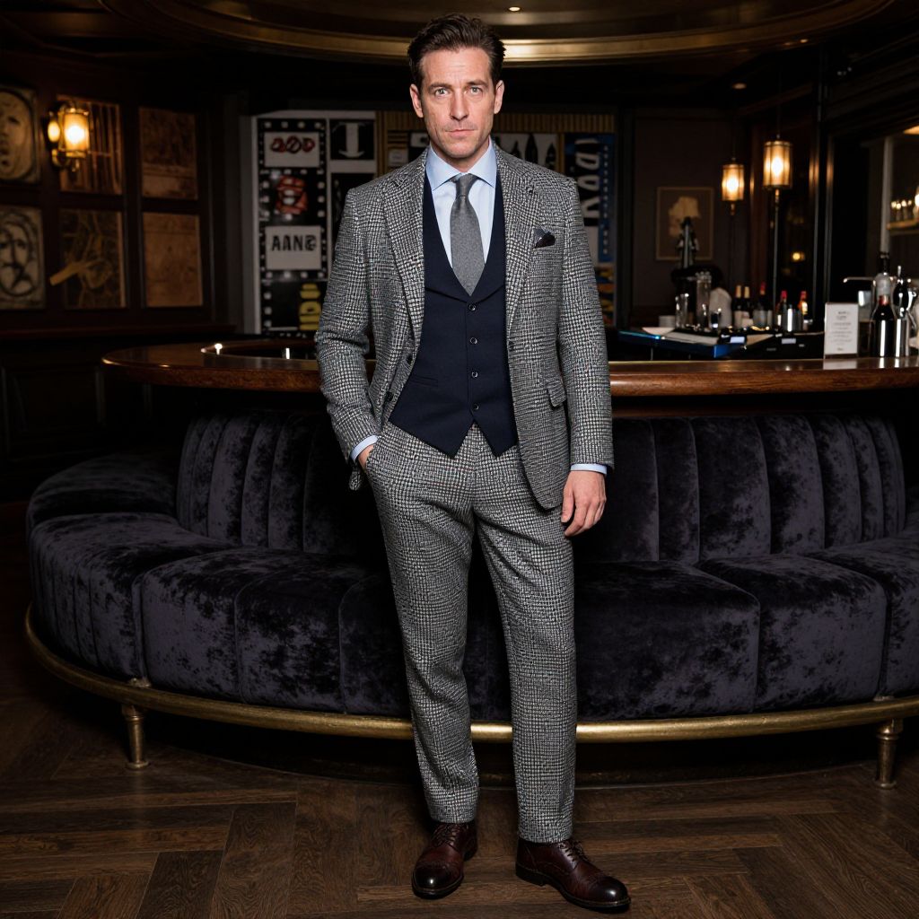 A man, medium grey houndstooth suit, navy waistcoat, light blue dress shirt, solid grey tie, dark brown leather brogues, glistening bar, velvet lounge seating, DJ booth elevated, lithographic film style, confident expression. Man has masculine face and piercing eyes