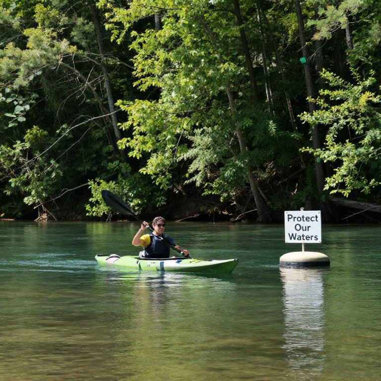 A person in a kayak on a serene, clear river, surrounded by tall trees and a forested landscape, with a 'Protect Our Waters' sign on a buoy, emphasizing the importance of preserving natural ecosystems.