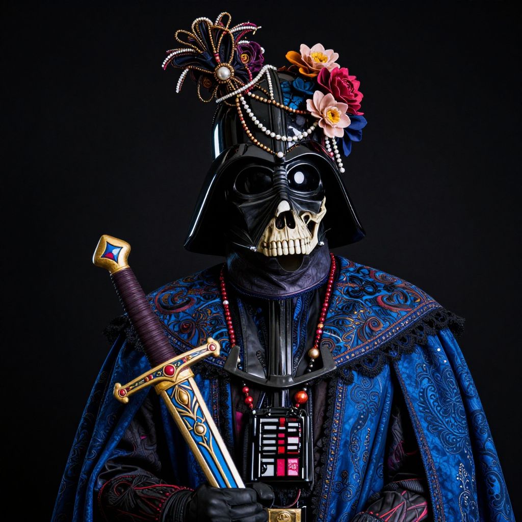 Photograph of a stylized, skeletal Darth Vader-like figure in a dark, intricate costume. The figure wears a black helmet with a skull face, adorned with pearl necklaces, a red rosette, and colorful flowers. A blue, ornate cloak with intricate patterns drapes over the shoulders. In the right hand, a gleaming gold and blue sword with a black handle is held. The background is solid black, highlighting the vivid colors and details of the costume. The overall style blends elements of cosplay, traditional Mexican folk art, and sci-fi.