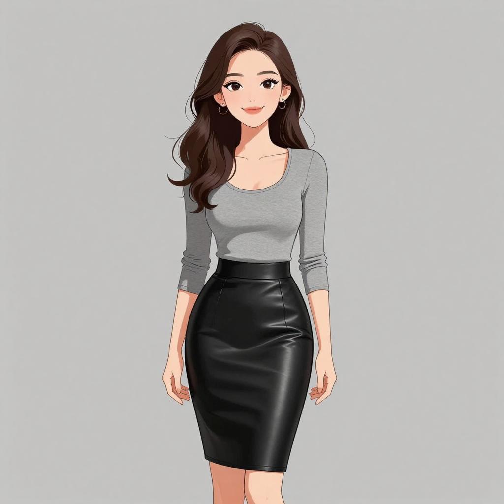 This digital anime-style drawing depicts a young woman with long, wavy dark brown hair and fair skin. She is smiling gently and standing against a plain light blue background. She wears a form-fitting, light gray, long-sleeved top with a scoop neckline and a high-waisted, black leather pencil skirt that accentuates her hourglass figure. Her arms are relaxed by her sides. The drawing uses clean, bold lines and a soft color palette, emphasizing her stylish and modern appearance. The overall style is reminiscent of contemporary Japanese anime character illustrations.