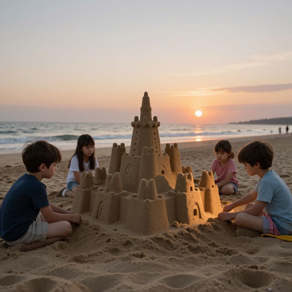 Children construct sandcastles that unfold into miniature, breathing cities when kissed by twilight’s first breath.