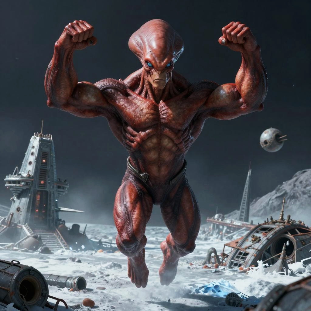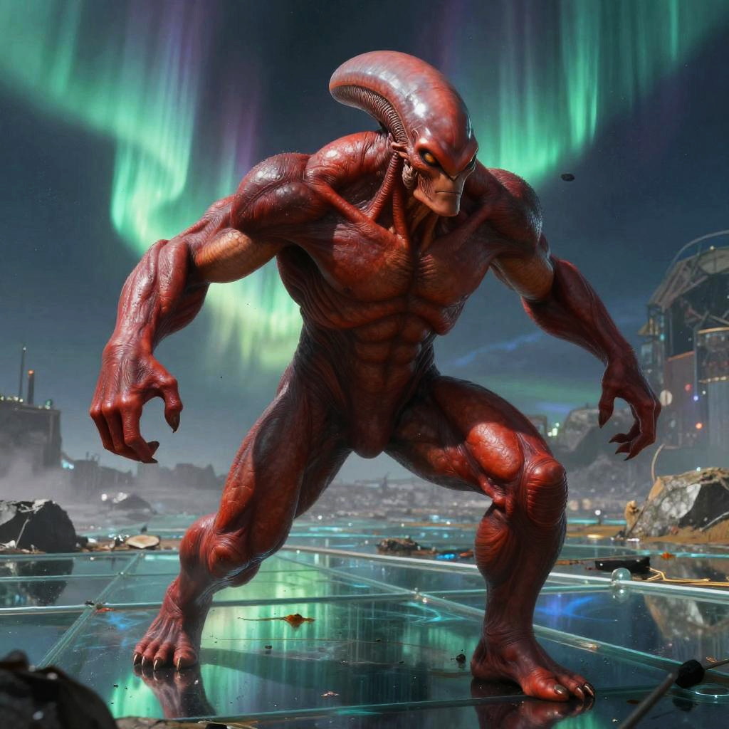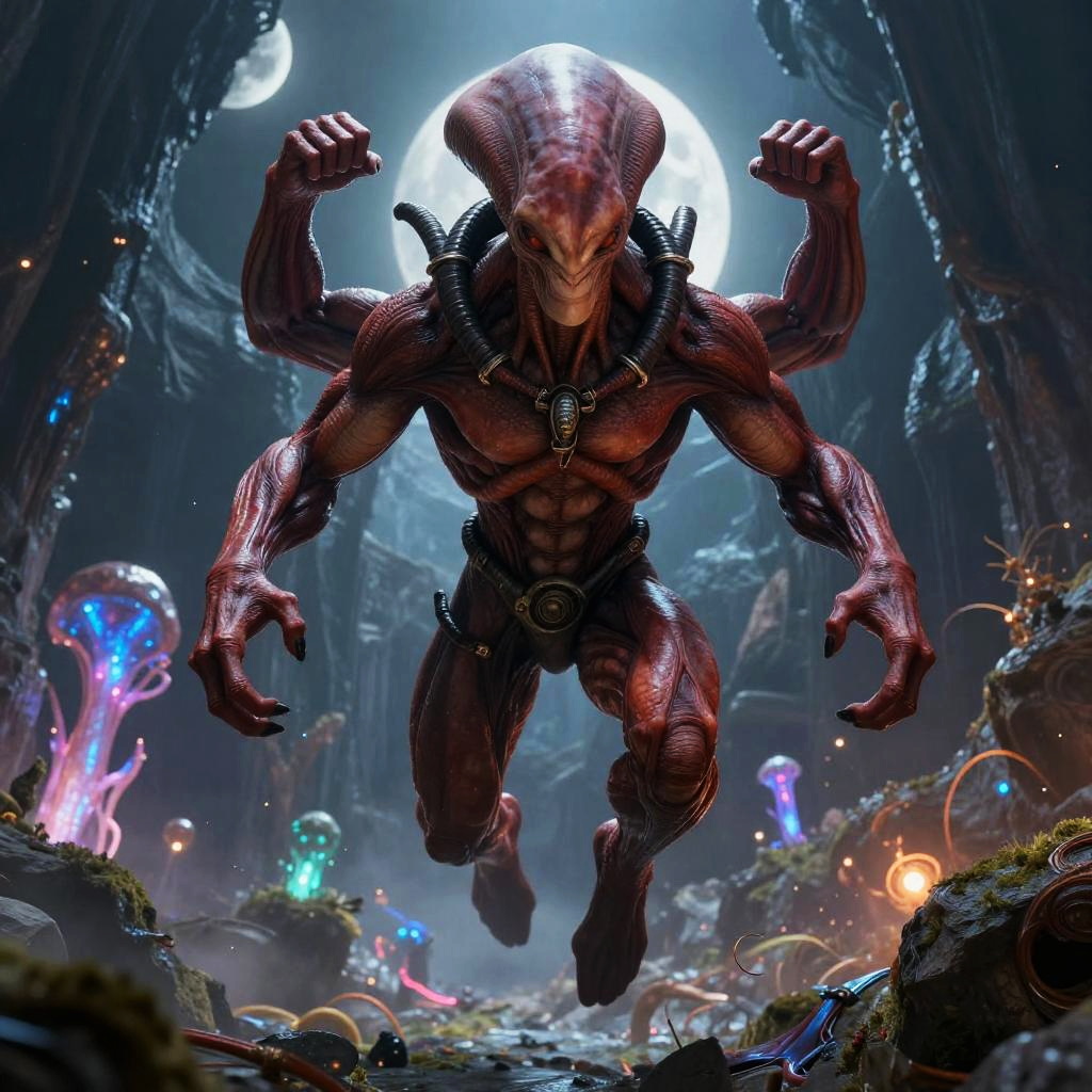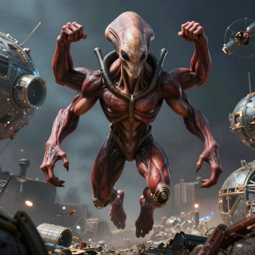 A red-skinned, four-armed alien stands in a hovering serenely, by artist Jamie Jones. Its muscular arms are flexed, and its piercing gaze is fixed on an unseen foe. In the background, a shattered orbital satellite graveyard, hinting at the intergalactic conflict that rages on. The level of detail in the aliens scales and musculature is hyper-realistic, creating a sense of raw strength and power.