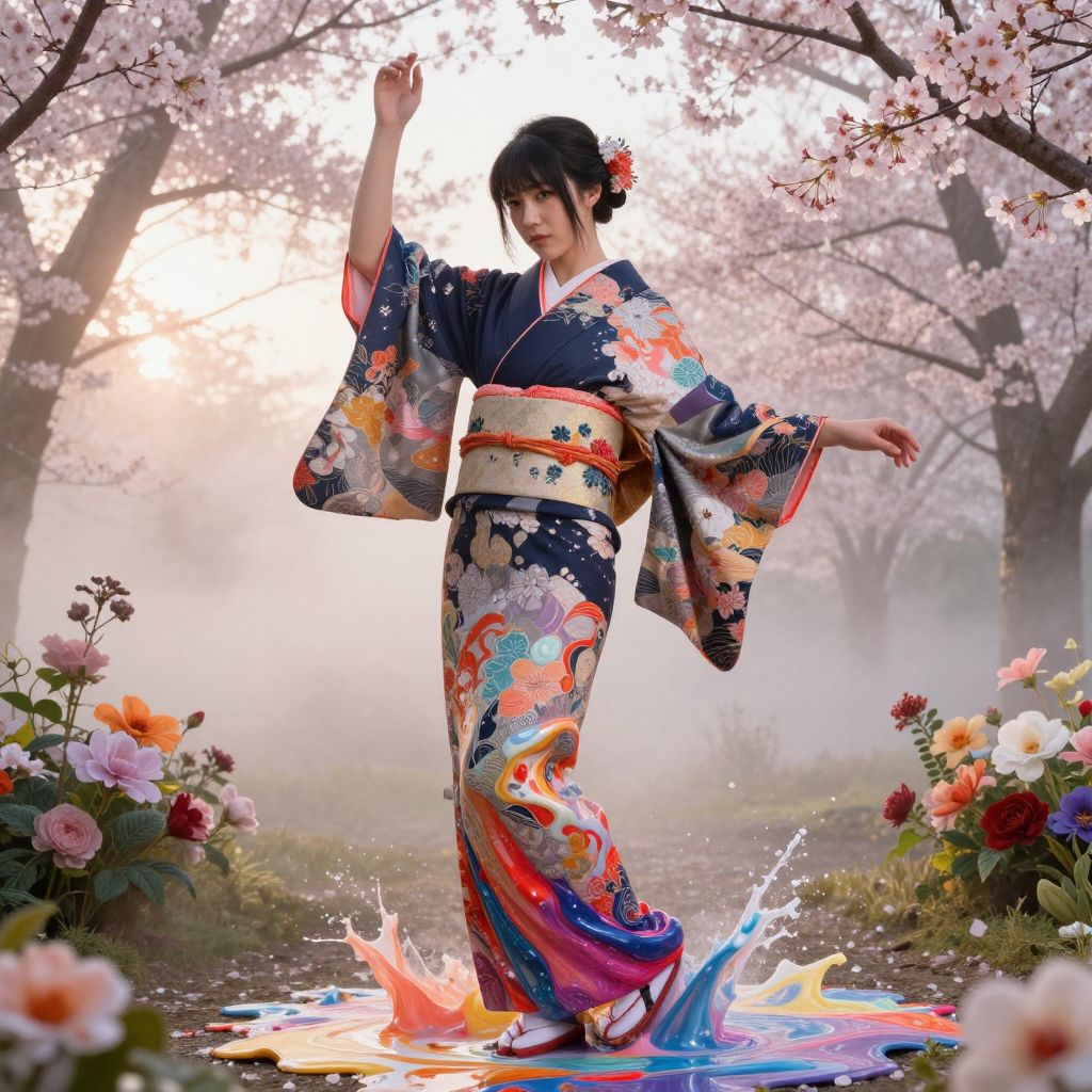 A stunning woman with a face like Kou Shibasaki and a body type like Meisa Kuroki, wearing an intricate detailed kimono, dissolves into colorful liquid oil paint, surrounded by a foggy sunrise in a sakura garden, with realistic flowers like Rachel Ruysch, featuring cinematic lighting and a dynamic pose.