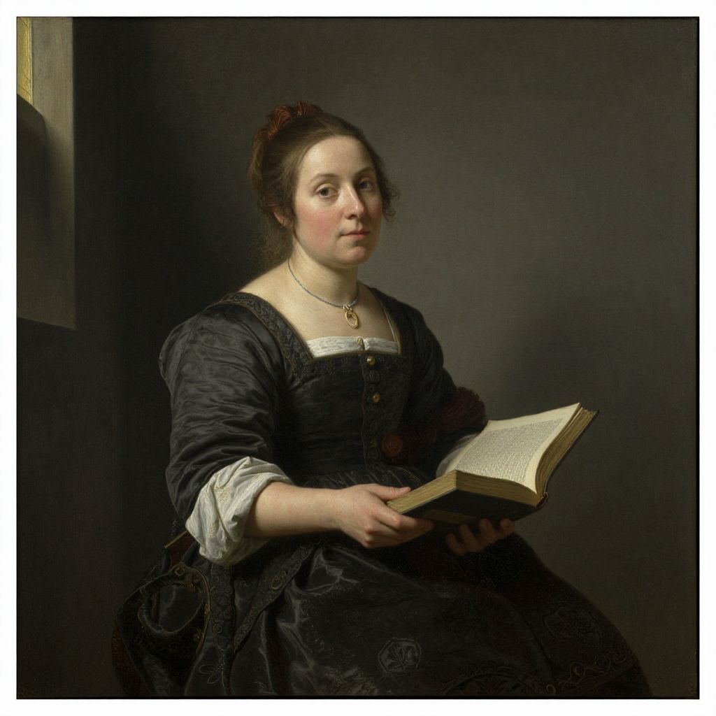 17th-century oil painting of a fair-skinned woman with dark hair, wearing a black dress and white sleeves, holding an open book, against a