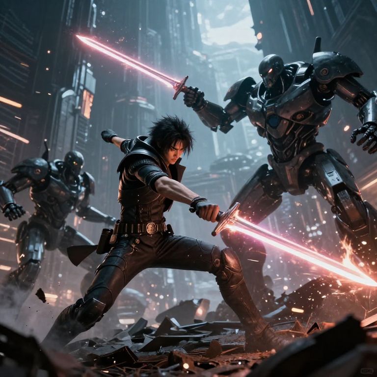 Digital artwork of a spiky-haired warrior wielding a glowing red lightsaber, battling three robotic enemies in a futuristic, ruined cityscape.