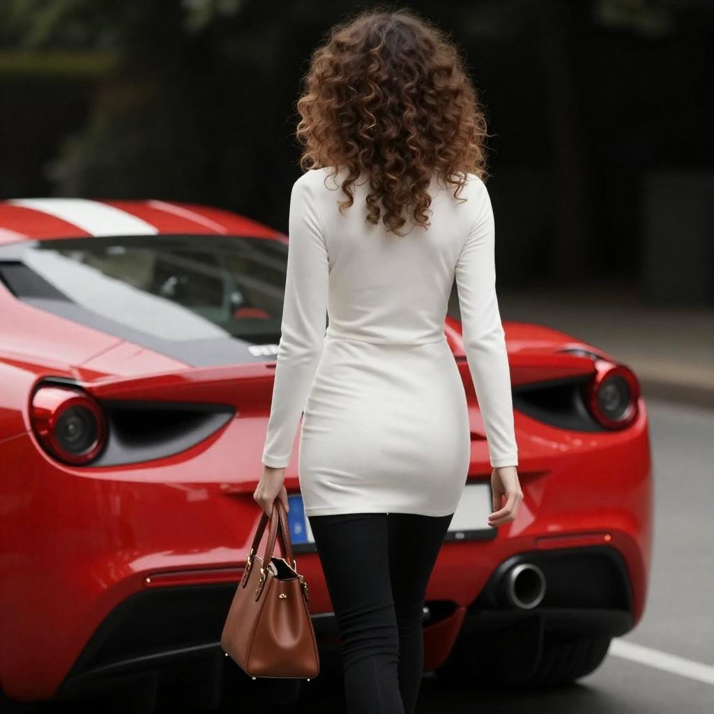 Photograph of a woman with curly hair, wearing a white long-sleeve dress and black pants, walking towards a bright red Ferrari with a white racing stripe. She carries a brown leather handbag in her right hand. The background is dark with blurred greenery. The car's rear lights are visible, and the scene is brightly lit.