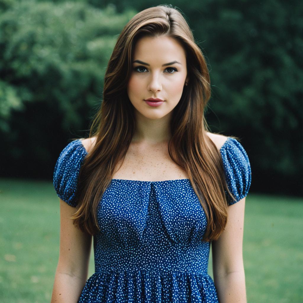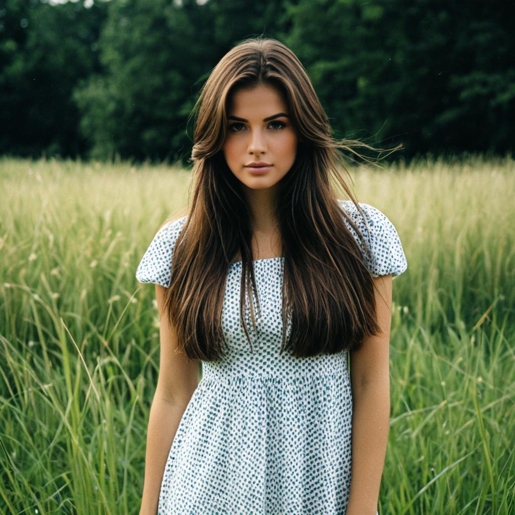 English garden party attire,1girl, solo, dress, brown hair, long hair, breasts, sandals
