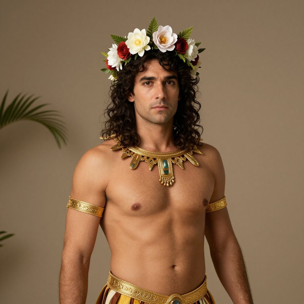 Photograph of a medium-build, olive-skinned man with long, curly black hair wearing a floral crown with white, yellow, and red flowers. He is shirtless, showcasing a toned, muscular torso, and adorned with a gold, intricate necklace and armlets. His lower body is clothed in gold, patterned fabric around his waist. The background is a plain beige wall with a partial green palm leaf on the left. The man has a serious expression, with dark eyebrows and brown eyes, standing upright facing the camera. The image has a classic, slightly vintage feel.
